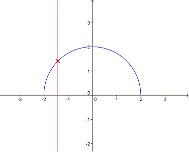Por ejemplo, la gráfica de ésta función, dibujada en azul, parece un semicírculo. Sabemos que y es una función de x porque por cada coordenada x hay exactamente una coordenada y.