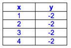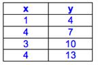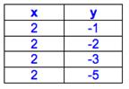 Cada fila en la tabla describe un par ordenado de ésta forma: una x de -1 corresponde a una y de 3, resultando el par ordenado (-1, 3). Una x de -2 corresponde a una y de 5, por lo que el par ordenado es (-2, 5). La tabla completa nos da el conjunto de pares ordenados: