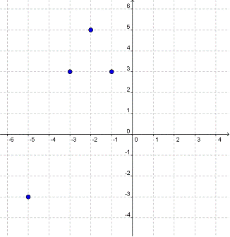 Otro conjunto de pares ordenados: {(3,-1),(5,-2),(3,-3),(-3,5)} una de las entradas, 3, puede producir dos salidas diferentes, -1 y -3. Ya sabes lo que significa — éste conjunto de pares ordenados no es una función. Una gráfica lo puede confirmar: