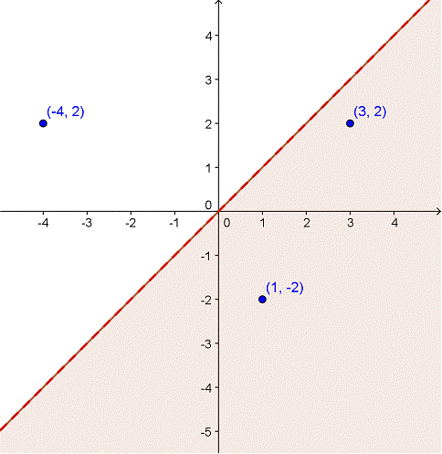 The boundary line is represented by a dotted line along x = y. All of the points under the line are shaded; this is the range of points where the inequality x > y is true. Take a look at the three points that have been identified on the graph. Do you see that the points in the boundary region have x values greater than the y values, while the point outside this region do not?