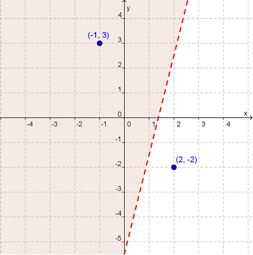 Si sustituimos (-1, 3) en y > 4x − 5.5, encontramos 3 > 4(-1) − 5.5, o 3 > -9.5. Esto es una declaración válida. Parece que debemos sombrear el área hacia la izquierda de la recta.
