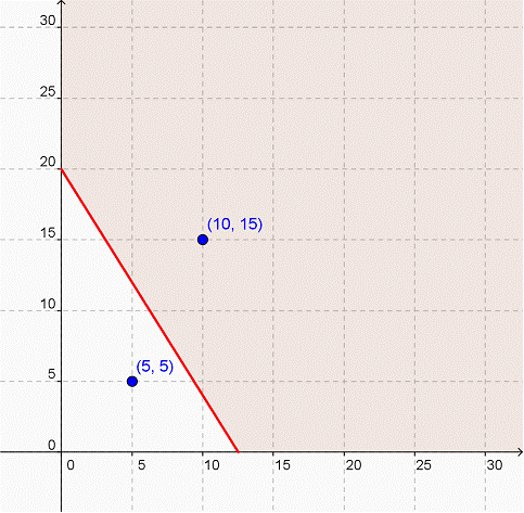 Podemos usar los dos pares ordenados para confirmar que hemos sombreado la región correcta. Si sustituimos (10, 15) en la desigualdad, encontramos 8(10) + 5(15) ≥ 100, la cual es una declaración válida. Sin embargo, si usamos (5, 5) creamos una declaración inválida: 8(5) + 5(5) es sólo 65, y es menor que 100.