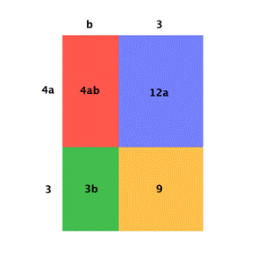 Abajo hay una representación visual de lo que acabamos de hacer. Nota cómo los términos individuales en los factores se multiplican para crear los cuatro términos del polinomio original. El rectángulo completo tiene dimensiones (b + 3) y (4a + 3). Los cuatro rectángulos más pequeños que conforman su área son cada término diferente en el polinomio original. La forma factorizada y la forma original del polinomio son equivalentes.