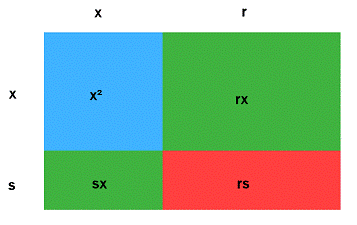 Una forma de entender por qué este método funciona es observar qué pasa cuando la expresión (x + r)(x + s) es evaluada: se convierte en x2 + rx + sx + rs, como se muestra en el diagrama de abajo. El cuadro azul es x2, el cual se encuentra en ambas formas del polinomio. El rectángulo rojo representa rs en la forma expandida, la versión de 4 términos del polinomio y c en el trinomio original. Los dos rectángulos verdes son rx + sx en la forma expandida y bx en la expresión original.