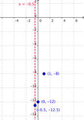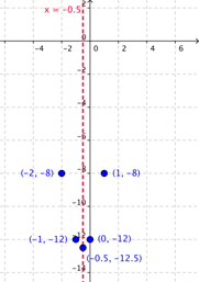 | Graficar el vértice (-0.5, -12.5) y dibujar el eje de simetría x = -0.5. |