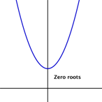 Other helpful features of a quadratic equation are the roots of a quadratic equation. The roots are the points where the parabola touches or crosses the x-axis. The x-coordinates at those points are known as the x-intercepts. (The y-coordinates are 0.) Depending on the nature of the graph (the direction of the U-shape and the location of the vertex), a quadratic function can have zero, one, or two roots. Take a moment and think about what a parabola that intersects with the x-axis in only one place would look like? In two places? What would a parabola look like that doesn’t cross the x- axis at all?