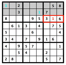 What we can do instead is figure out the specific placements for this puzzle based on the rules of the game and the numbers that are given. In the top row of 3 X 3 boxes in the puzzle above, the left and middle boxes already have a 1. The 1 in the right box can't be in the first or second rows, because they already have 1s. So the 1 for the right box has to be in the third row, and there's only one place for that. Deductive reasoning has revealed the location of the 1 in the right box!