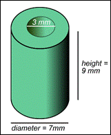 | A machine takes a solid cylinder with a height of 9 mm and a diameter of 7 mm, and bores a hole all the way through it. The hole that it creates has a diameter of 3 mm. Which of the following expressions would correctly find the volume of the solid?