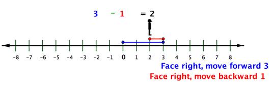How do you subtract a negative number? First face and move forward in a negative direction to the first number, −2. Then continue facing in a negative direction (to the left), but move backward to subtract −3.