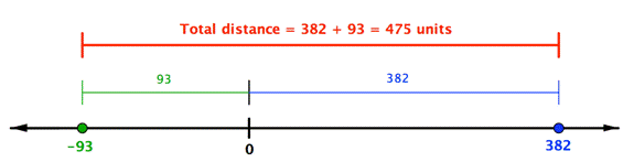 Another way to think about subtracting is to think about the distance between the two numbers on the number line. In the example above, 382 is to the right of 0 by 382 units, and −93 is to the left of 0 by 93 units. The distance between them is the sum of their distances to 0: 382 + 93.