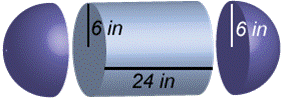 Problema | Si el radio de los extremos esféricos mide 6 pulgadas, encuentra el volumen del siguiente sólido. Usa 3.14 por
