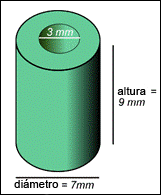 Una máquina toma un cilindro sólido de 9 mm de altura y 7 mm de diámetro, y le hace un agujero de lado a lado. El agujero que crea tiene un diámetro de 3 mm. ¿Cuál de las siguientes expresiones calcula correctamente el volumen del sólido?