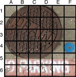 This “map” uses a horizontal and vertical grid to convey information about an object’s location. Notice that the letters A-F are listed along the top, and the numbers 1-6 are listed along the left edge. The general location of any item on this map can be found by using the letter and number of its grid square. For example, you can find the item that exists at square “4F” by moving your finger along the horizontal to letter F and then straight down so you are in line with the 4. You’ll find a blue disc is at this location on the map.