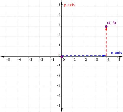 From 4 on the x-axis move up to the point and notice the number with which it aligns on the y-axis. The 3 indicates that, after leaving the x-axis, you traveled 3 units up in the vertical direction, the direction of the y-axis. This number is the y-coordinate, the second number in the ordered pair. With an x-coordinate of 4 and a y-coordinate of 3, you have the ordered pair (4, 3).