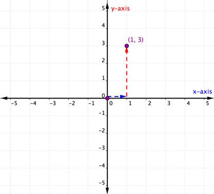 | The x-coordinate is 1 because it comes first in the ordered pair. Start at the origin and move a distance of 1 unit in a positive direction (to the right) from the origin along the x-axis. | The y-coordinate is 3 because it comes second in the ordered pair. From here move directly 3 units in a positive direction (up). If you look over to the y-axis, you should be lined up with 3 on that axis. |