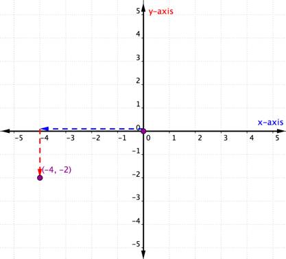 | The x-coordinate is −4 because it comes first in the ordered pair. Start at the origin and move 4 units in a negative direction (left) along the x-axis. | The y-coordinate is −2 because it comes second in the ordered pair. Now move 2 units in a negative direction (down). If you look over to the y-axis, you should be lined up with −2 on that axis. |