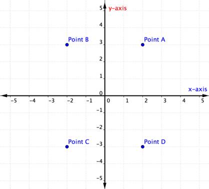 Ordered pairs within any particular quadrant share certain characteristics. Look at each quadrant in the graph below. What do you notice about the signs of the x- and y-coordinates of the points within each quadrant?