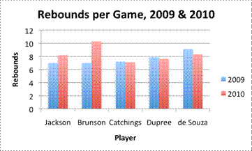 | Jackson and Brunson | Two players had higher rebound averages in 2010 than they did in 2009. This is indicated by the red bar being taller than the blue bar. The other players’ red bars are shorter, so their rebounds decreased. |