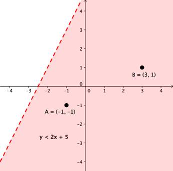 The dashed line is y = 2x + 5. Every ordered pair in the colored area to the right of the line is a solution to y < 2x + 5. Skeptical? Try substituting the x and y coordinates of Points A and B into the inequality—you’ll see that they work.