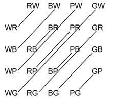 | Ahora, ¿cuál es la diferencia cuando el orden no importa? WR y RW son el mismo resultado, al igual que WB y BW, etc. En este diagrama, cada resultado está relacionado con su resultado equivalente. Como sólo necesitas uno de cada par, quedan la mitad de las soluciones | ||||||||||||||||||||||||||||||||||||||||||||||