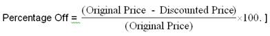 [Hint: First calculate the difference between the original price and the discounted price and then determine the percentage off. The formula would be: