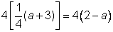 | Apply the distributive property to expand 4(2a + 3) to 8a + 12 and −3(a – 1) to −3a + 3.