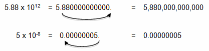 Cuando trabajan con números muy grandes o muy pequeños, los científicos, matemáticos, e ingenieros normalmente usan la notación científica para expresar dichas cantidades. La notación científica usa la notación exponencial. Los siguientes ejemplos muestran la notación científica.