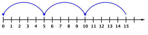 You could also use a number line to model this division. Just as you can think of multiplication as repeated addition, you can think of division as repeated subtraction. Consider how many jumps you take by 5s as you move from 15 back to 0 on the number line.