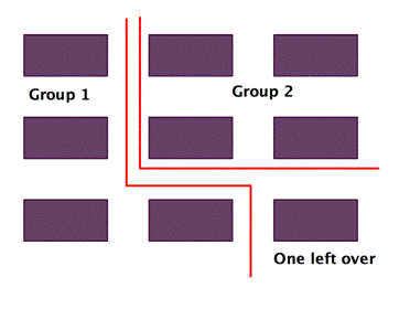 Sometimes when you are dividing, you cannot easily share the number equally. Think about the division problem 9 ÷ 2. You could think of this problem as 9 pieces of chocolate being split between 2 people. You could make two groups of 4 chocolates, and you would have one chocolate left over.