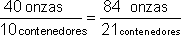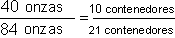Cuando usamos éste tipo de proporción, es importante que los numeradores representen la misma situación – en el ejemplo anterior, 40 onzas dan 10 vasos – y los denominadores representan la misma situación, 84 onzas dan 21 vasos.