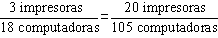| Problema | Una oficina tiene 3 impresoras para 18 computadoras. Otra oficina tiene 20 impresoras para 105 computadoras. ¿Es la razón de impresoras y computadoras la misma para ambas oficinas? |