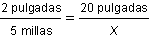 | Un mapa usa una escala donde 2 pulgadas representan 5 millas. Si la distancia entre dos ciudades aparece en el mapa como 20 pulgadas, ¿cuántas millas separan a las dos ciudades?