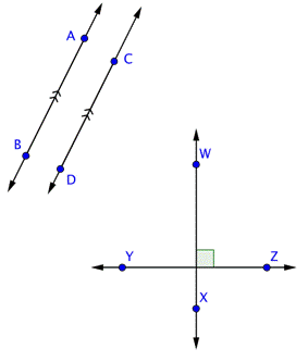 | Parallel lines never meet, and perpendicular lines intersect at a right angle.