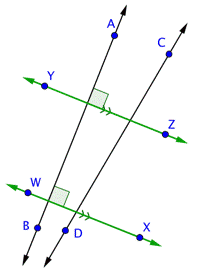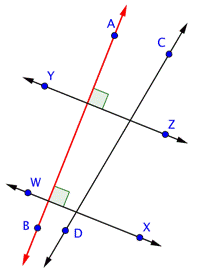 If two lines are parallel, then any line that is perpendicular to one line will also be perpendicular to the other line. Similarly, if two lines are both perpendicular to the same line, then those two lines are parallel to each other. Let’s take a look at one example and identify some of these types of lines.
