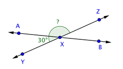 Not all intersections happen at right angles, though. In the example below, notice how you can use the same technique as shown above (using straight angles) to find the measurement of a missing angle.