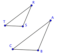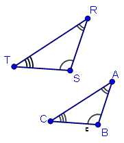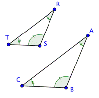 | Imagen que muestra las medidas de los ángulos de ambos triángulos. | Imagen que muestra los triángulos ABC y RST usando marcas para mostrar la congruencia de sus ángulos. |