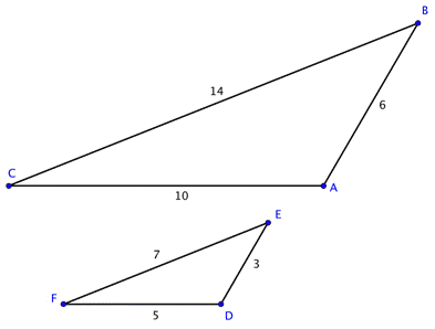 Si los lados correspondientes son proporcionales, entonces los triángulos son similares. Los triángulos ABC y DEF son similares pero no congruentes.