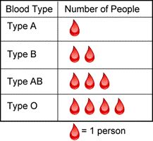 To read this pictograph, all you need is the scale—the number of people that each blood drop symbol represents. In this graph, each blood drop represents 5 people. There are six drops next to Type A, so 5 • 6 = 30 people had Type A blood. The table below shows the rest of the information.