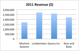 The bar graph below shows total revenue for four fictional companies in 2011. Notice that the scale, on the y-axis, is very large—each horizontal line represents an increase of $500,000. For this reason, it is difficult to tell exactly how much money each company made in 2011. However, comparing the bars is straightforward—glancing at the data, you can tell that Lumbertown earned the most (a little over $2,500,000), while Machine Systems earned the least (about $1 million less, at just over $1,500,000).