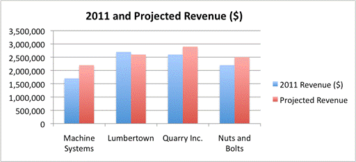The blue columns remain, but now they are accompanied by four new red columns that represent the projected revenue for these companies. Again, this data could be expressed in a table—with a bar graph, you gain ease of quick comparison, but lose the detail of the exact values. Looking at this graph tells you that while Lumbertown has the highest revenue for 2011, it is projected to decrease. Conversely, Machine Systems is projected to increase its revenue. Seeing data visually can help you understand the story that the data is telling about a situation.