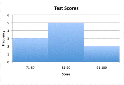Looking at the scores, you can tell that some people scored in the 70s, some scored in the 80s, and some scored in the 90s. You can organize the data in a histogram with the continuous data from 0 to 100, by using the intervals 71-80, 81-90, and 91-100.