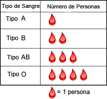 Para poder leer este pictograma, sólo necesitamos la escala (el número de personas que representa cada gota de sangre). En la gráfica, cada gota de sangre representa 5 personas. Hay seis gotas en el Tipo A, entonces 5 • 6 = 30 personas tienen sangre tipo A. La tabla siguiente muestra el resto de la información.