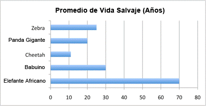 Estos datos están bien en una tabla pero representarlos con una gráfica de barras nos permite comparar las diferentes esperanzas de vida más fácil. Observa la gráfica de barras siguiente. En este ejemplo, los animales se enlistan en el lado izquierdo de la gráfica (también llamado eje-y), y su esperanza de vida se enlista en la parte de abajo (el eje-x). La gráfica muestra la información con la longitud de la barra asociada con cada animal.