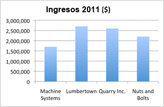 La gráfica de barras siguiente muestra la ganancia total para cuatro compañías ficticias en el 2011. Observa que la escala, en el eje-y, es muy grande: cada línea horizontal representa un aumento de $500,000. Por esta razón, es difícil ver cuánto dinero ganó cada compañía en el 2011. Sin embargo, se pueden comparar las barras rápidamente: con un vistazo a la gráfica, puedes saber que Lumbertown ganó más que todas (poco más de $2,500,000), mientras que Machine Systems fue la que ganó menos (alrededor de $1,500,000).
