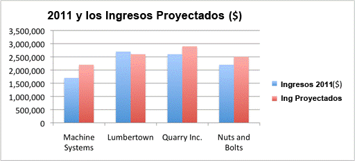 Las columnas azules son las mismas, pero ahora están acompañadas de cuatro nuevas columnas de color rojo que representan la ganancia proyectada. Si bien los datos pueden expresarse en una tabla, con una gráfica de barras puedes hacer una comparación rápida, aunque pierdes los detalles de los valores exactos. Observando esta gráfica sabemos que a pesar de que Lumbertown tuvo las mejores ganancias en el 2011, sus ganancias proyectadas decrecieron. De lo contrario, Machine Systems proyecta un aumento en sus ganancias. Estudiar los datos visualmente puede ayudarnos a entender la historia que nos cuentan los datos.