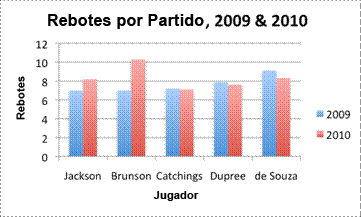 La gráfica muestra dos conjuntos de datos — uno para el 2009, en azul, y el otro para el 2010, en rojo. Para comparar los datos de un año y del otro, compara las alturas de las dos barras para cada jugador. |