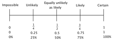 Probability provides a measure of how likely it is that something will occur. It is a number between and including the numbers 0 and 1. It can be written as a fraction, a decimal, or a percent.