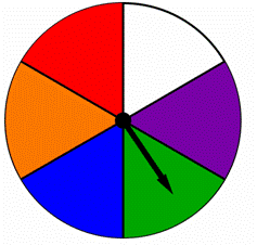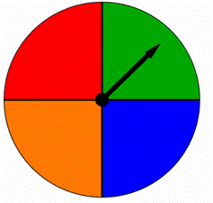 | A spinner is divided into four equal parts, each colored with a different color as shown below. When this spinner is spun, the arrow points to one of the colors. Are the outcomes equally likely?