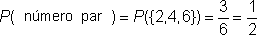 | Problema | Un juego requiere tirar un dado de 6 caras numerado del 1 al 6. ¿Cuál es la probabilidad de sacar un número par? | |