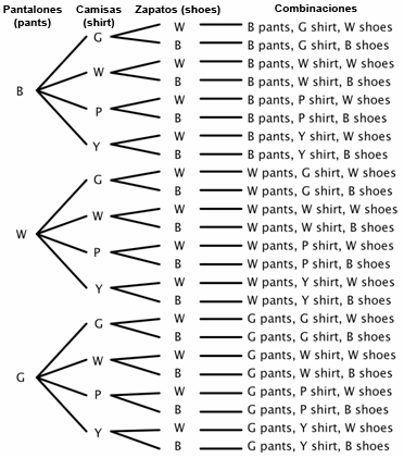 Supongamos que un clóset tiene tres pares de pantalones (negro, blanco, y verde), cuatro camisas (verde, blanco, morado, y amarillo), y dos pares de zapatos (blanco, y negro). ¿Cuántas posibles combinaciones se pueden tener? Existen 3 opciones de pantalón, 4 opciones de camisa, y 2 opciones de zapatos. Para nuestro diagrama de árbol, usemos B para negro, W para blanco, G para verde, P para morado, y Y para amarillo.